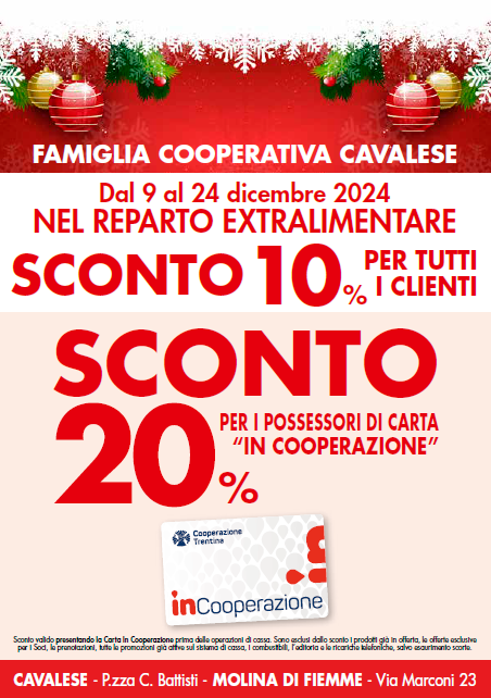 Sconto del 20% nel periodo Natalizio presso i punti vendita di Cavalese extra e Molina di Fiemme extra