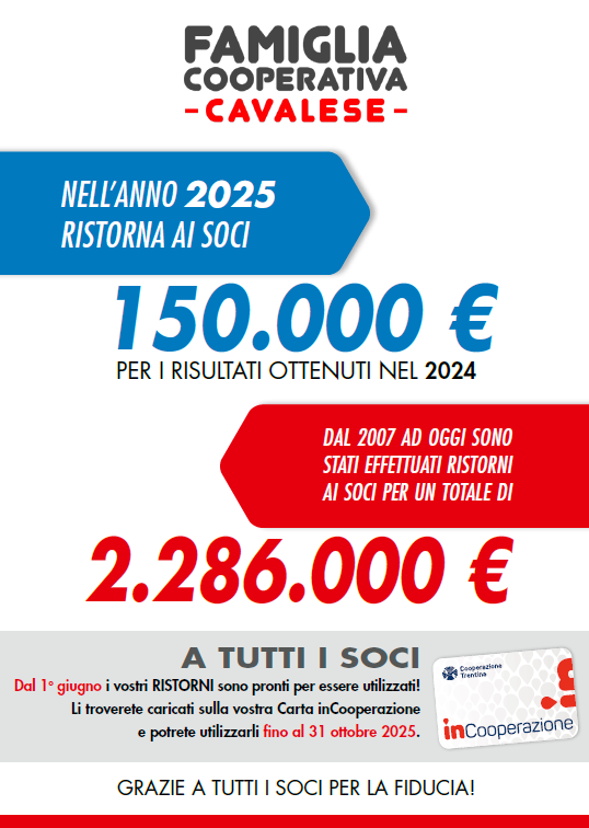 Dal 2007 grazie agli ottimi risultati ottenuti dalla Famiglia Cooperativa di Cavalese, il Consiglio di Amministrazione ha ritenuto opportuno ripagare la fedeltà dei propri Soci effettuando dei ristorni da usufruire presso i nostri punti vendita.